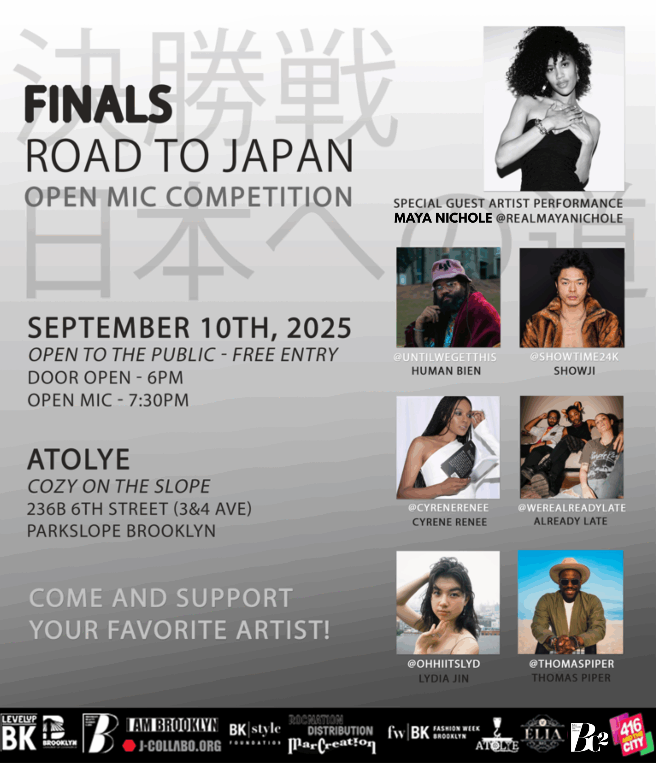 The Finals of the “Road to Japan” Open Mic Competition will be held on September 10th, 2025 (Wednesday), at Atolyein Park Slope, Brooklyn.