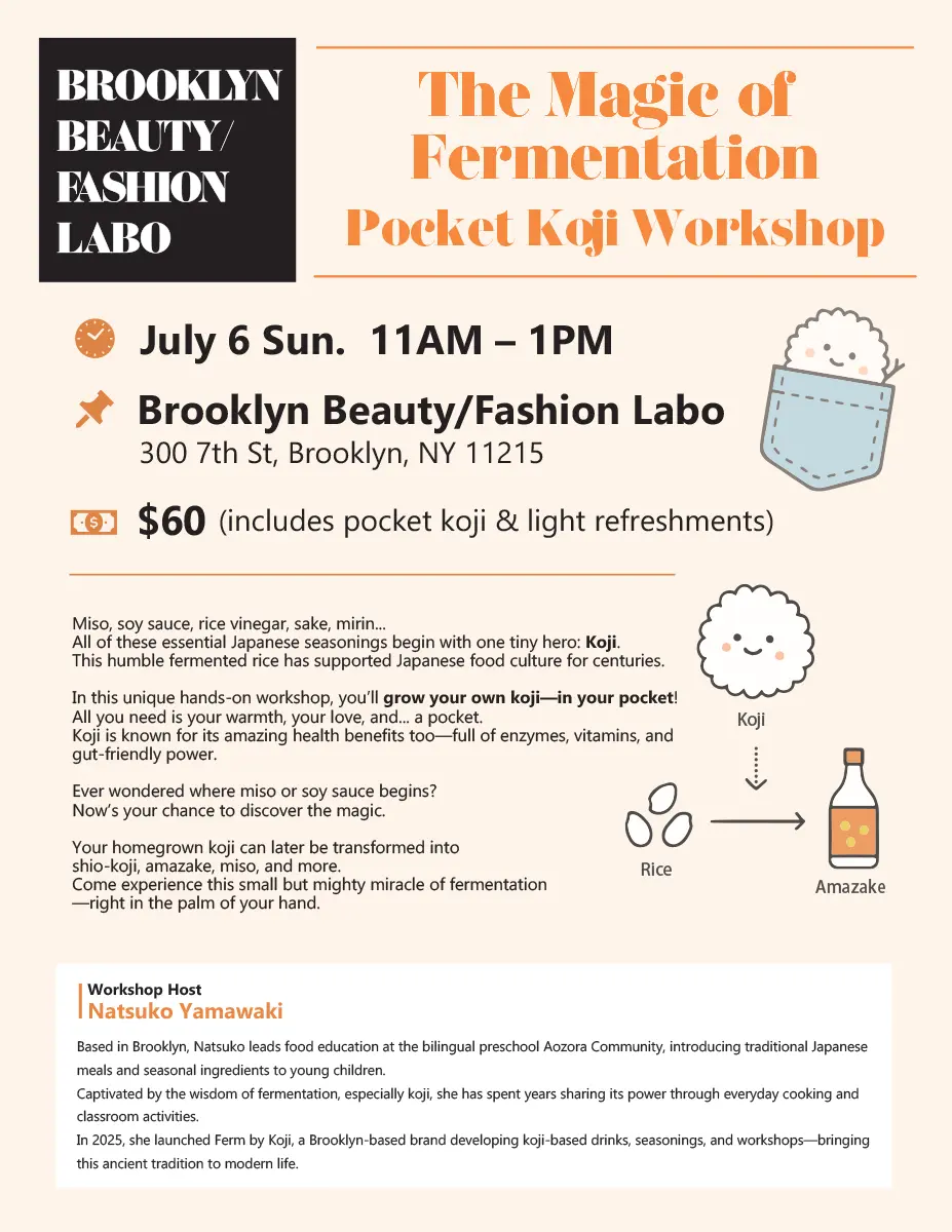 It is a hands-on fermentation workshop where you’ll actually grow your own koji in your pocket—yes, really! All it takes is warmth, love, and a little curiosity.