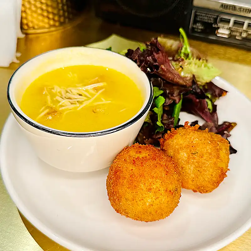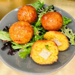 Tomato risotto with beef ragù, mozzarella, peas, and Parmigiano – the godfather of arancini.
