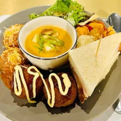 Japanese curry rice with panko-fried tofu, coconut curry drizzle – warming and crave-worthy.