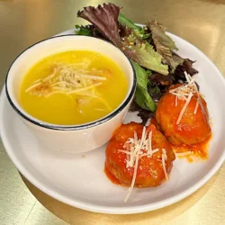 Beef & pork meatball with Parmigiano and herbs in San Marzano tomato sauce.