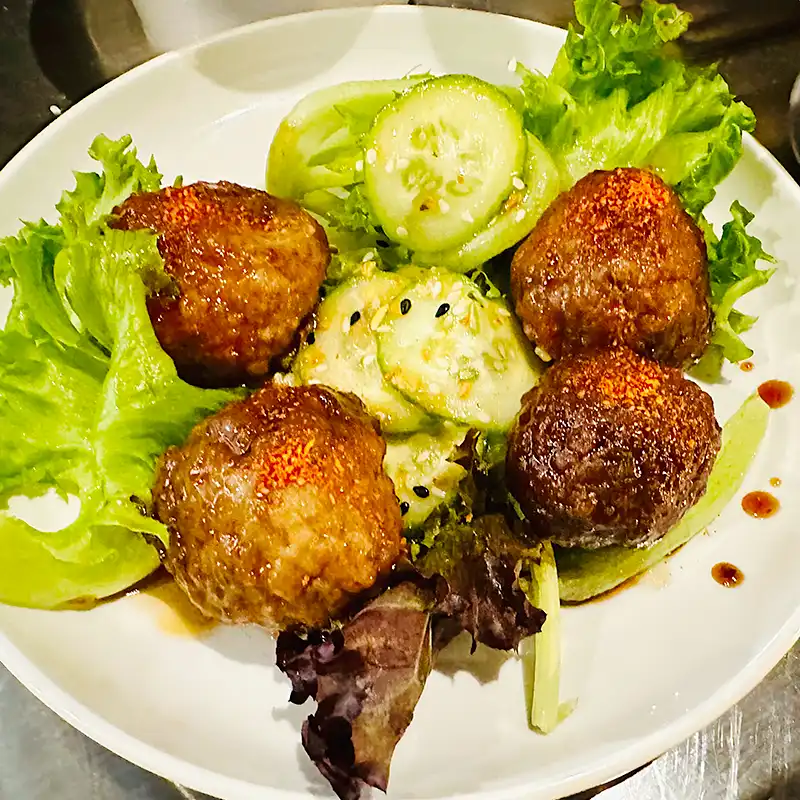 Ground chicken with scallion and ginger, tare-glazed, topped with togarashi.