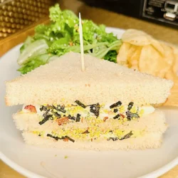 Creamy Japanese-style egg salad with rice vinegar and sugar, topped with shredded nori.