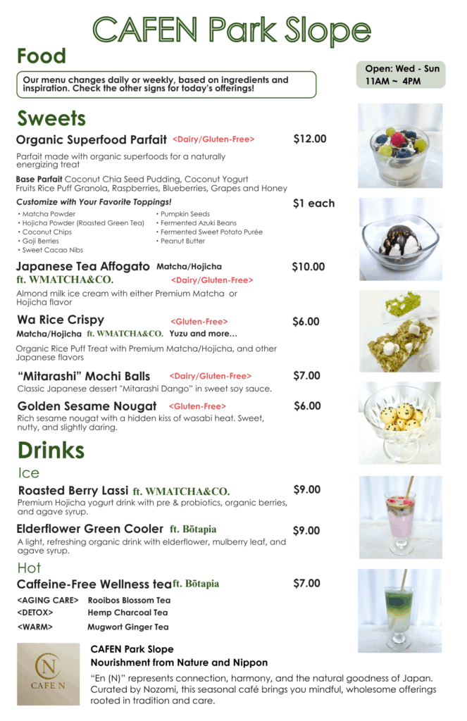 CAFEN Park Slope is a seasonal cafe inspired by the spirit of Japan, offering nourishing, mindful dishes rooted in tradition and care. Curated by Nozomi, the space reflects harmony, connection, and seasonal beauty. We offer a variety of gluten-free, dairy-free, and caffeine-free options to accommodate different dietary needs.
